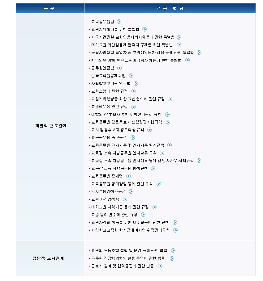 ±³¿øÀÇ ³ëµ¿°ü°è¸¦ ±ÔÀ²ÇÏ´Â ¹ý±Ô¿¡´Â¡¸±³À°°ø¹«¿ø¹ý¡¹,¡¸±³¿øÁöÀ§Çâ»óÀ» À§ÇÑ Æ¯º°¹ý¡¹µî ´Ù¾çÇÑ ¹ý±ÔµéÀÌ Àû¿ëµÇ°í ÀÖ½À´Ï´Ù.