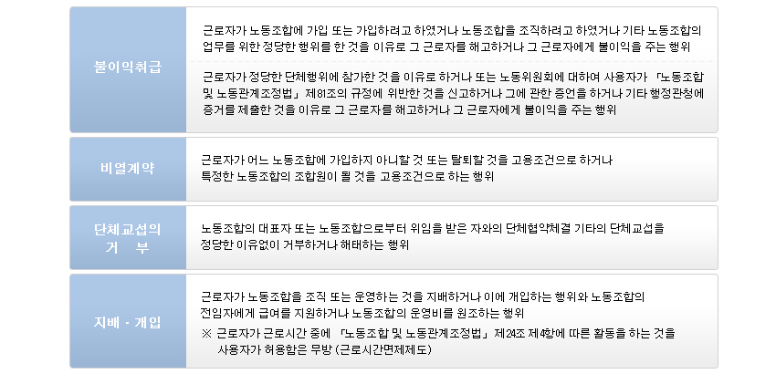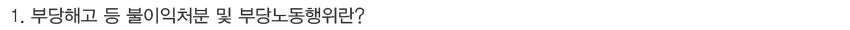 'ºÎ´çÇØ°í µî ºÒÀÌÀÍóºÐ'À̶õ »ç¿ëÀÚ°¡ ±Ù·ÎÀÚ¿¡°Ô Á¤´çÇÑ ÀÌÀ¯ ¾øÀÌ ÇØ°í, ÈÞÁ÷, Á¤Á÷, ÀüÁ÷, °¨ºÀ ±× ¹ÛÀÇ Â¡¹úÀ» ÇÑ °æ¿ì¸¦ ¸»Çϸç, 'ºÎ´ç³ëµ¿ÇàÀ§'¶õ »ç¿ëÀÚ°¡ ±Ù·ÎÀÚÀÇ ³ëµ¿Á¶ÇÕȰµ¿°ú °ü·ÃÇÑ ³ëµ¿3±Ç(´Ü°á±Ç, ´Üü±³¼·±Ç, ´ÜüÇൿ±Ç)À» Ä§ÇØÇÏ´Â ÇàÀ§¸¦ ¸»ÇÕ´Ï´Ù. ÀÌ °æ¿ì ±Ù·ÎÀÚ´Â ³ëµ¿À§¿øÈ¸¿¡ ±¸Á¦½ÅûÀ» ÇÒ ¼ö ÀÖ½À´Ï´Ù.
